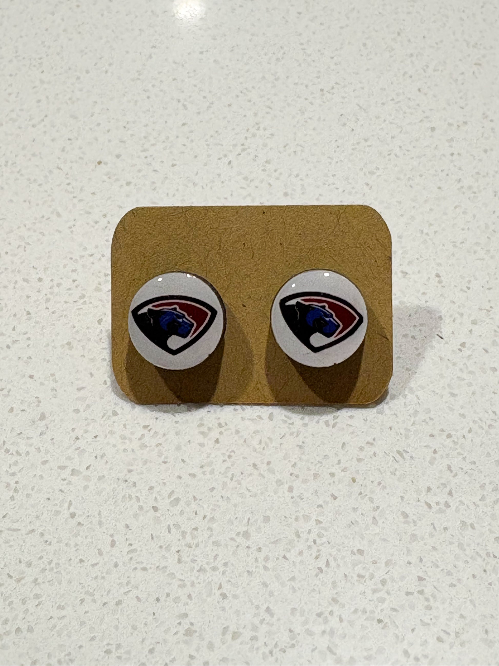 MDF stud earring sublimated and personalized with team Logo and your Players number or two logos. The stud backing is made from surgical stainless steel and very friendly to sensitive ears.