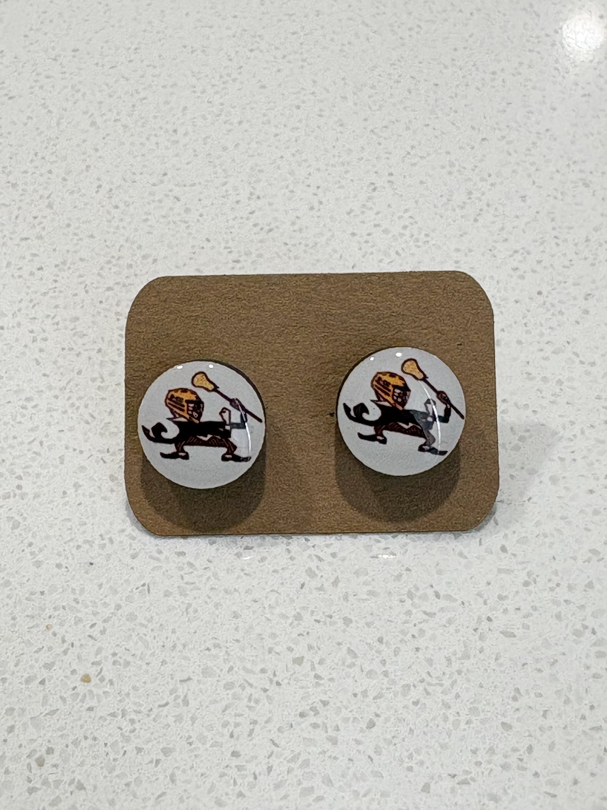 MDF stud earring sublimated and personalized with team Logo and your Players number or two logos. The stud backing is made from surgical stainless steel and very friendly to sensitive ears.