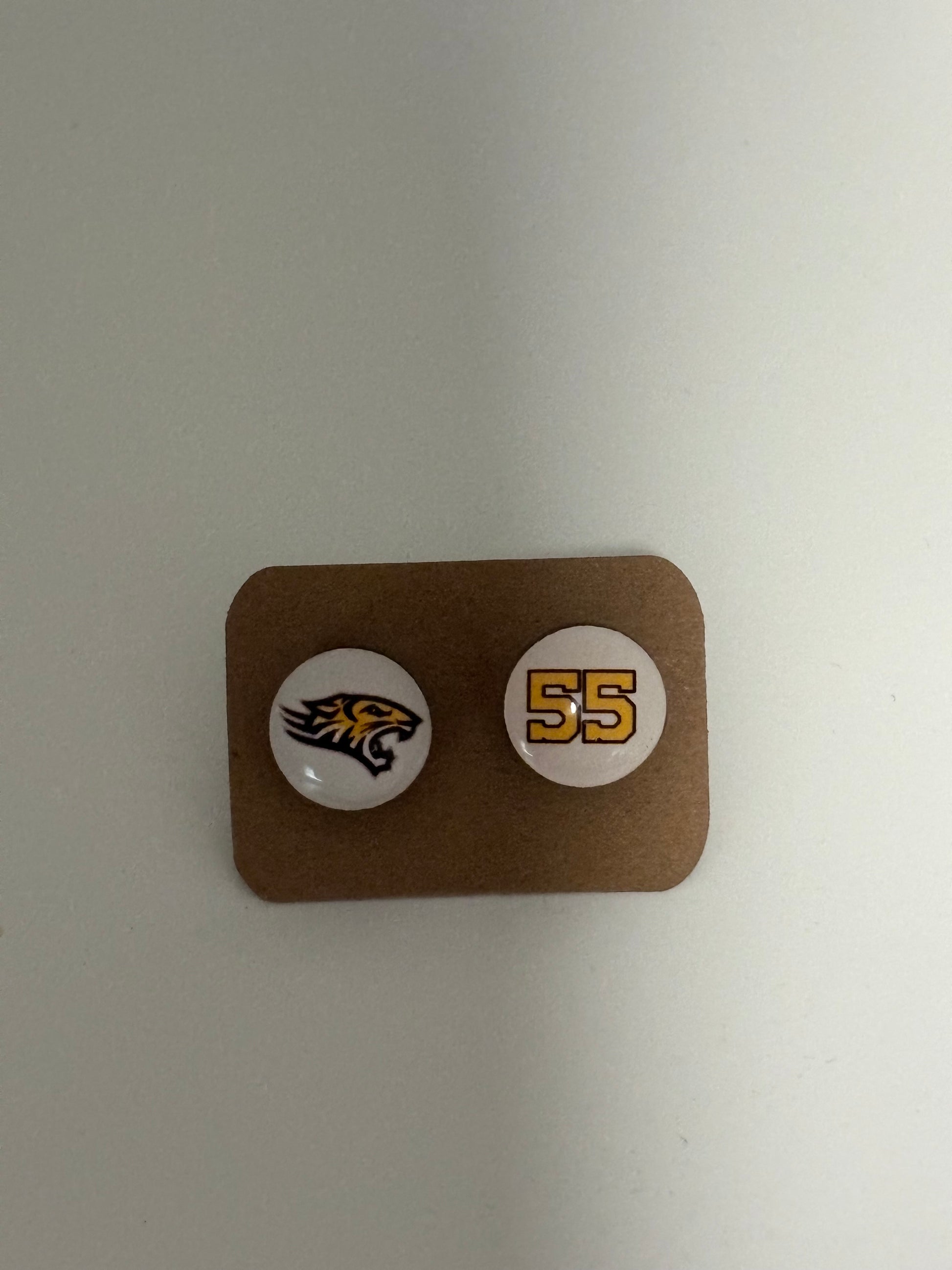 MDF stud earring sublimated and personalized with team Logo and your Players number or two logos. The stud backing is made from surgical stainless steel and very friendly to sensitive ears.
