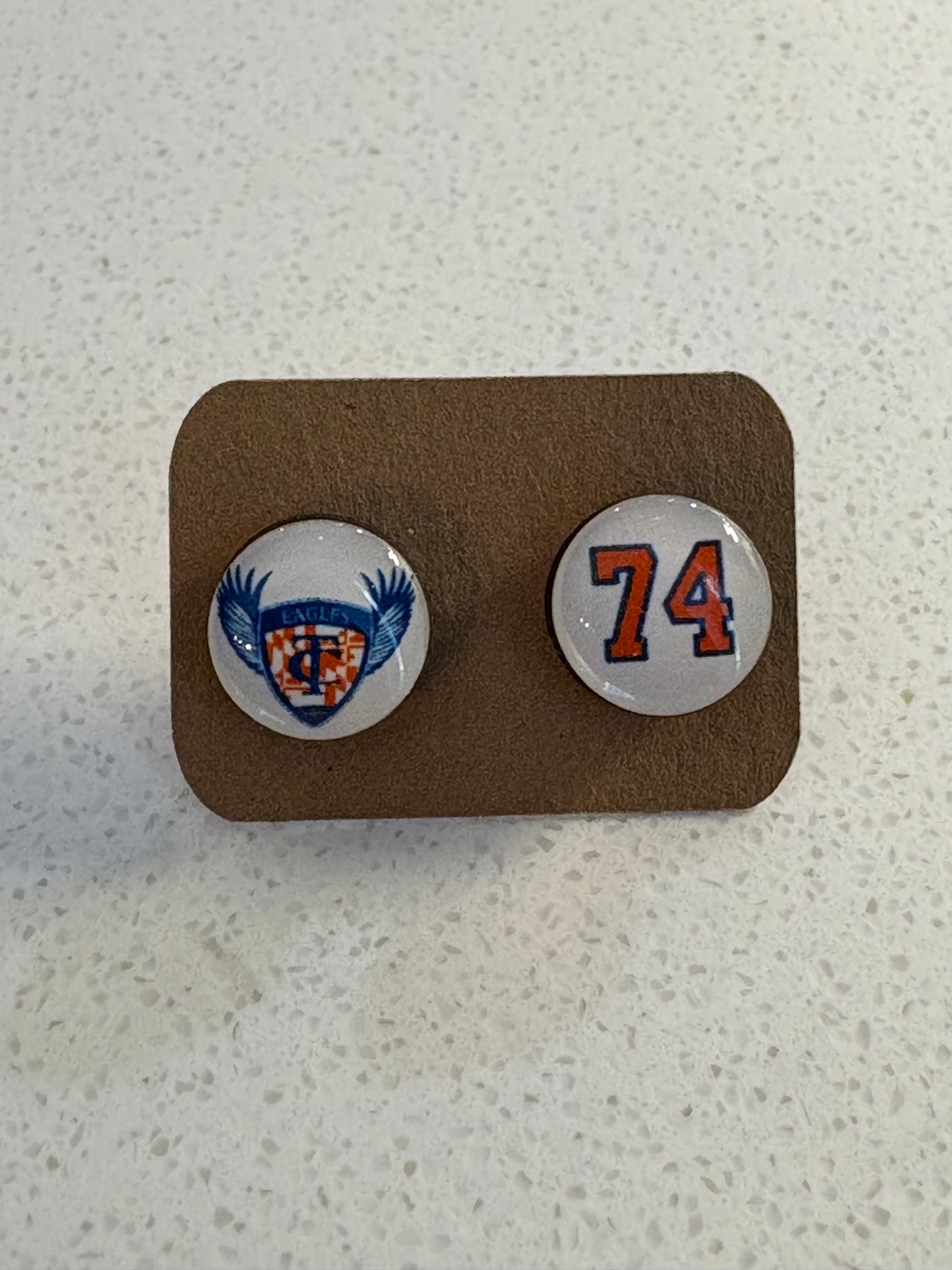 Stud earring personalized with Logo and your players number or two logos. The stud backing is made from stainless steel and very friendly to sensitive ears.